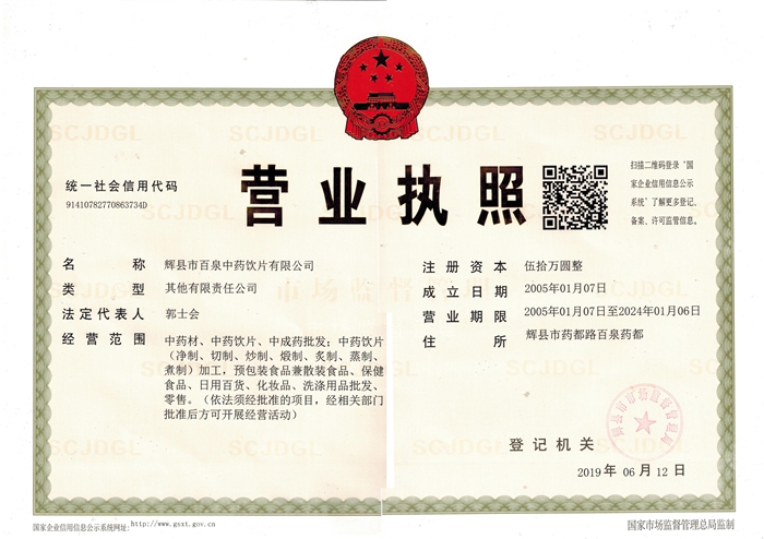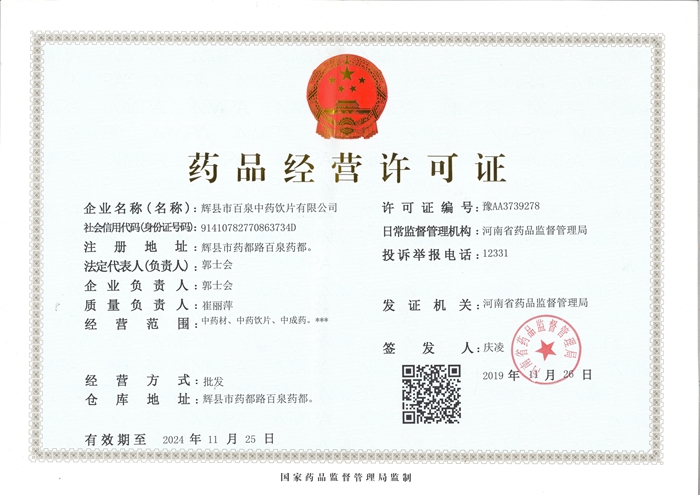 輝縣市百泉中藥飲片公司是河南百泉藥都集團(tuán)的下屬機(jī)構(gòu),位于百泉藥都院內(nèi)。2004年12月31日取得《藥品經(jīng)營許可證》,2007年5月取得《藥品生產(chǎn)許可證》。公司經(jīng)營范圍:中成藥、中藥材、中藥飲片的批發(fā)和銷售,中藥材、中藥飲片的收購及加工,經(jīng)營品種達(dá)上千種。